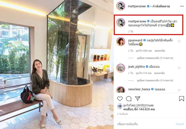 อีกทั้ง สาวแมท ได้ออกมาโพสต์รูปภาพพร้อมกับแคปชั่น เป็นคนดีไปทำไมเขาชอบคนถูกใจไม่ใช่คนดีปายๆๆ ซึ่งก็ทำเอาชาวเน็ตอดที่จะจับโยงไม่ได้ว่าแอบแซะใครหรือไม่