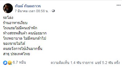 โดย หนุ่มกันต์ กันตถาวร ได้โพสต์ข้อความระบุว่า ” รถโล่ง ร้านอาหารเงียบ โรงแรมไม่มีคนเข้าพัก ห้างสรรพสินค้า คนน้อยมาก โรงพยาบาล ไม่มีคนกล้าไป ของขายไม่ได้ คนระวังการใช้เงินมากขึ้น สาธุ ประเทศไทย”