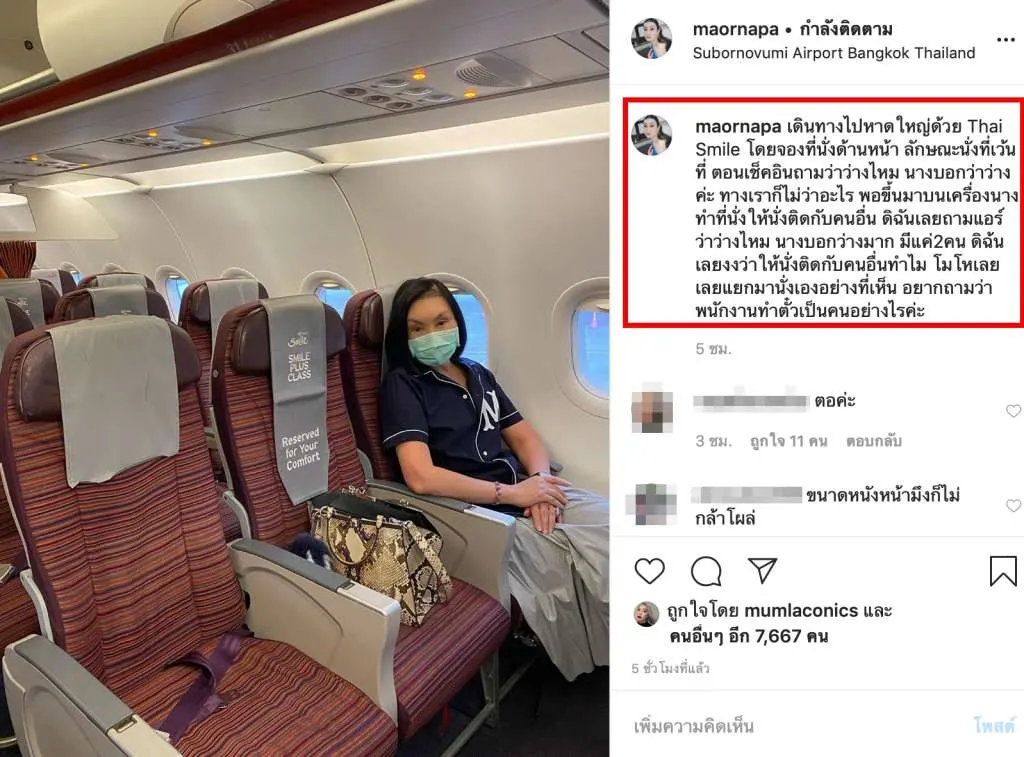 โดย “ม้า อรนภา” ได้เดินทางไปทำงานที่หาดใหญ่ จังหวัดสงขลา แล้วได้นั่งเครื่องบินของ Thai Smile โดยจองที่นั่งด้านหน้า ลักษณะนั่งที่เว้นที่ ซึ่งในขณะนั้นได้ถามทางด้านแอร์โฮสเตส ซึ่งก็บอกว่ามีที่ว่างเหลือมาก แต่สุดท้ายกลับได้นั่งติดกับคนอื่น ทำให้“ม้า อรนภา”โมโหจัด แฉผ่านโซเซียล ด้วยข้อความระบุว่า