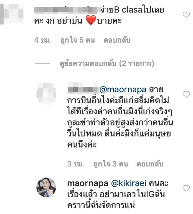 และ “จ่ายB clasaไปเลยคะ งก อย่าบ่น บายคะ” หรือ “สายการบินอื่นไงค่ะอีแก่สลิ่มคิดไม่ได้ทีเรื่องด่าคนอื่นมึงนี่เก่งจริงๆ กูละขำทำตัวอยู่สูงส่งกว่าคนอื่นวีนไปหมด ตื่นค่ะมึงก็แค่มนุษยคนนึงค่ะ” ซึ่งงานนี้ “ม้า อรนภา” ก็ไม่ยอมตอกกลับแรงว่า “คนละเรื่องแล้ว อย่ามาเลวในIGฉัน คราวนี้ฉันจัดการแน่”