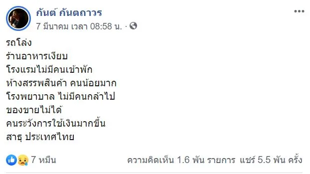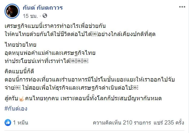 หลังจากที่ก่อนหน้านี้ กันต์ กันตถาวร ได้โพสต์ข้อความผ่านเฟซบุ๊คส่วนตัว พร้อมทั้งระบายความในใจเศรษฐกิจประเทศไทยในช่วงนี้ โดยระบุว่า ” รถโล่ง ร้านอาหารเงียบ โรงแรมไม่มีคนเข้าพัก ห้างสรรพสินค้า คนน้อยมาก โรงพยาบาล ไม่มีคนกล้าไป ของขายไม่ได้ คนระวังการใช้เงินมากขึ้น สาธุ ประเทศไทย”