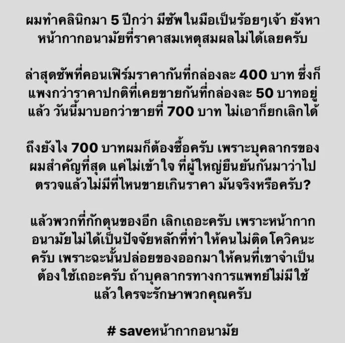 ถึงยังไง 700 บาทผมก็ต้องซื้อครับ เพราะบุคคลกรของผมสำคัญที่สุด แค่ไม่เข้าใจ ที่ผู้ใหญ่ยืนยันกันมาว่าไปตรวจแล้ว ไม่มีที่ไหนขายเกินราคา มันจริงหรือครับ? แล้วพวกที่กักตุนของอีก เลิกเถอะครับ เพราะหน้ากากอนามัยไม่ได้เป็นปัจจัยหลักที่ทำให้คนไม่ติดโควิดนะครับ เพราะฉะนั้นปล่อยของออกมาให้คนที่เขาจำเป็นต้องใช้เถอะครับ ถ้าบุคคลกรทางการแพทย์ไม่มีใช้แล้วใครจะรักษาพวกคุณครับ #หน้ากากอนามัย”
