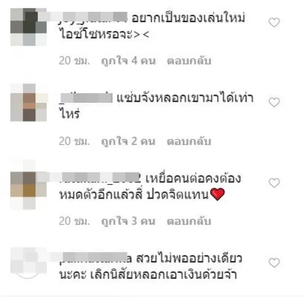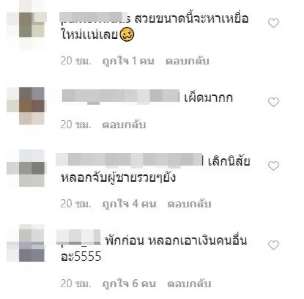 “เลิกได้เลิกนะ นิสัยจับผู้ชายรวย”, “แซ่บจังหลอกเขาได้เท่าไหร่”, “แซ่บจังหลอกเขามาได้เท่าไหร่”, “สวยขนาดนี้หาเหยื่อใหม่แน่เลย”, “พักก่อนหลอกเอาเงินคนอื่นอะ”