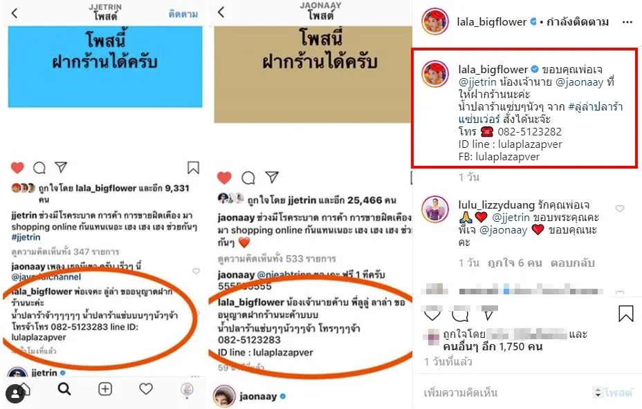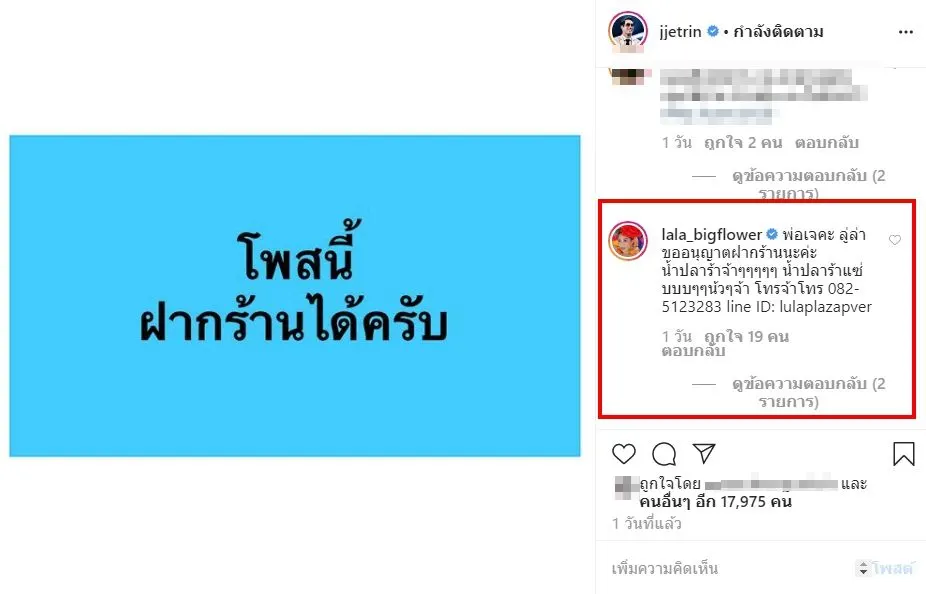 เเละจากวิกฤติการระบาดของ โควิด19 ในครั้งใน ทำให้กระทบไปถึงเศรษฐกิจการเงิน เจ เจตริน จึงได้โพสต์ไอจีเปิดพื้นที่ส่วนตัว ให้ทุกคนได้ฝากร้านขายของทำมาหากิน เป็นการช่วยเหลือซึ่งกันเเละกัน ซึ่งงานนี้ สาวลาล่า อาร์สยาม หลังโดนยกเลิกงานจ้าง2เดือน ก็ได้โผล่กลางไอจี เจ เจตริน เดินหน้าสู้ ขายน้ำปลาร้า กลางไอจี เจ เจตริน หลังโดนยกเลิกงานจ้างนานถึง 2 เดือนอีกด้วย!