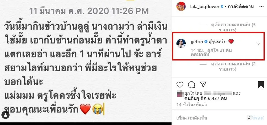 ซึ่งทางด้าน เจ เจตริน นั้นก็อดใจไม่ไหว โผล่คอมเมนต์กลางไอจี ลาล่า อาร์สยาม หลังเจอวิกฤติ โดนยกเลิกงานจ้าง นานถึง 2 เดือน! โดยงานนี้ เจ เจตริน ได้คอมเมนต์ให้กำลังใจ ลาล่า อาร์สยาม ว่า สู้ๆนะครับ อีกด้วย