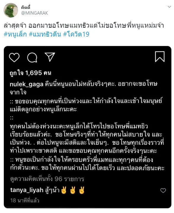 ทุกคนไม่ต้องห่วงนะคะหนูเล็กได้โทรไปขอโทษพี่แมทธิวเรียบร้อยแล้วค่ะ. ขอโทษจริงๆที่ทำให้ทุกคนไม่สบายใจ และเป็นห่วง. . ต่อไปหนูจะมีสติและใจเย็นๆ. ขอโทษทุกเรื่องราวที่ทำไปเพราะขาดสติ และขอขอบคุณทุกคนอีกครั้งจริงๆนะคะ