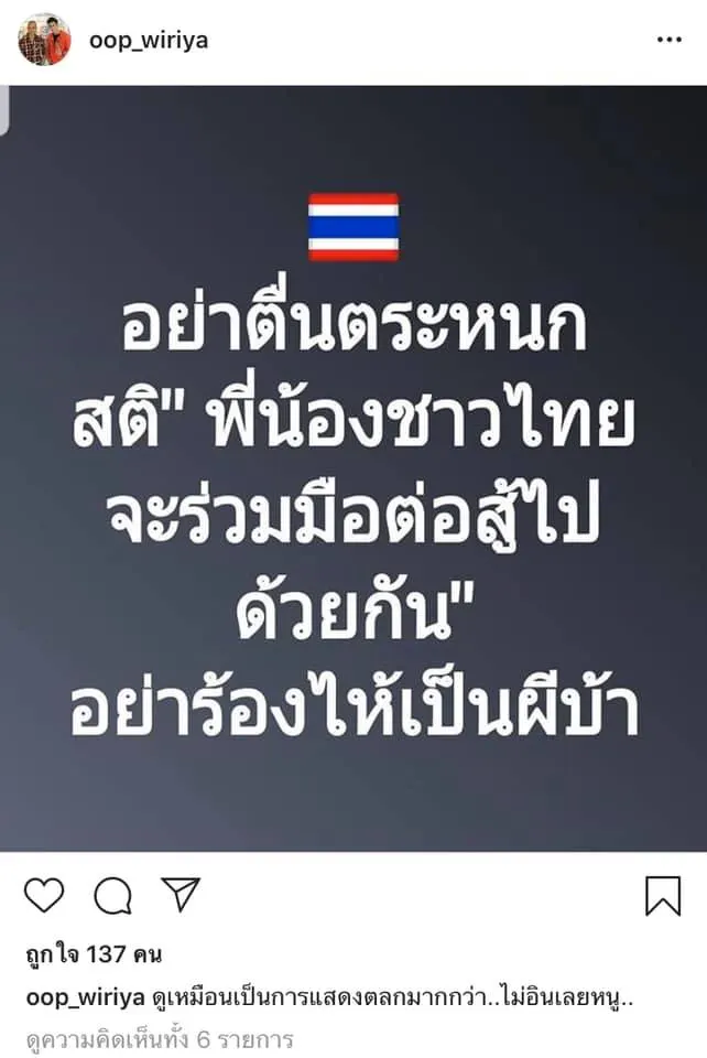 "อุ๊บ วิริยะ" โพสแซะใคร ? อย่าตื่นตระหนก สติ "พี่น้องชาวไทยจะร่วมมือต่อสู้ไปด้วยกัน" อย่าร้องไห้เป็นผีบ้า!