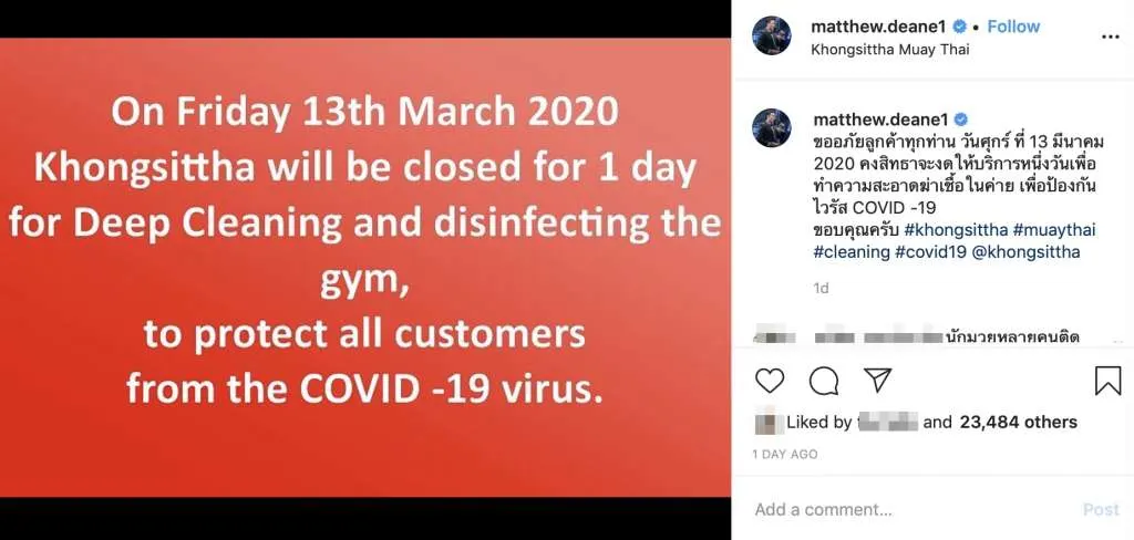 พร้อมกับสั่งประกาศปิดยิมของตนเพื่อทำการฆ่าเชื้อดังกล่าว พร้อมกับบอกให้คนใกล้ชิดเฝ้าระวังดูอาการหลังจากที่ได้สัมผัสกับตนในระยะเวลา 3-4 วันที่ผ่านมาด้วย