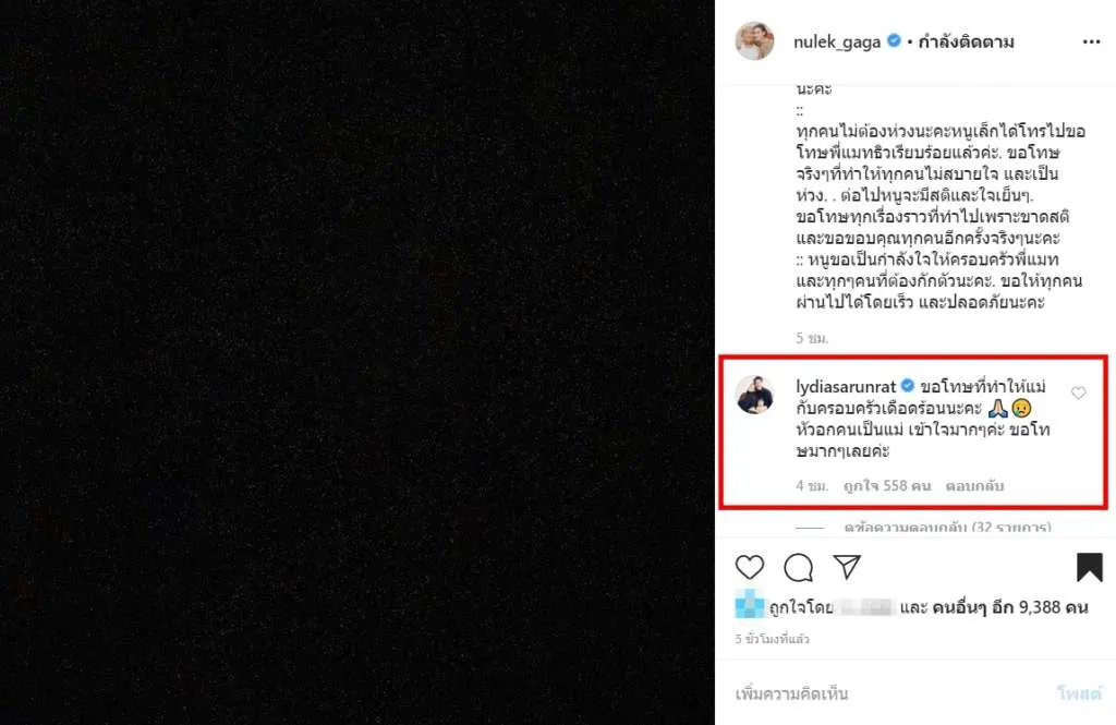 หลังจากนั้น สาวลิเดีย ก็ถึงกับทนไม่ไหว โผล่ขอโทษกลางไอจี หนูเล็ก ก่อนบ่าย หลังเห็นร้องไห้อย่างหนัก เพราะกลัวติดเชื้อโควิดจากสามี แมทธิว ดีน! ซึ่งงานนี้ สาวลิเดีย นั้นได้โพสต์ระบุข้อความว่า