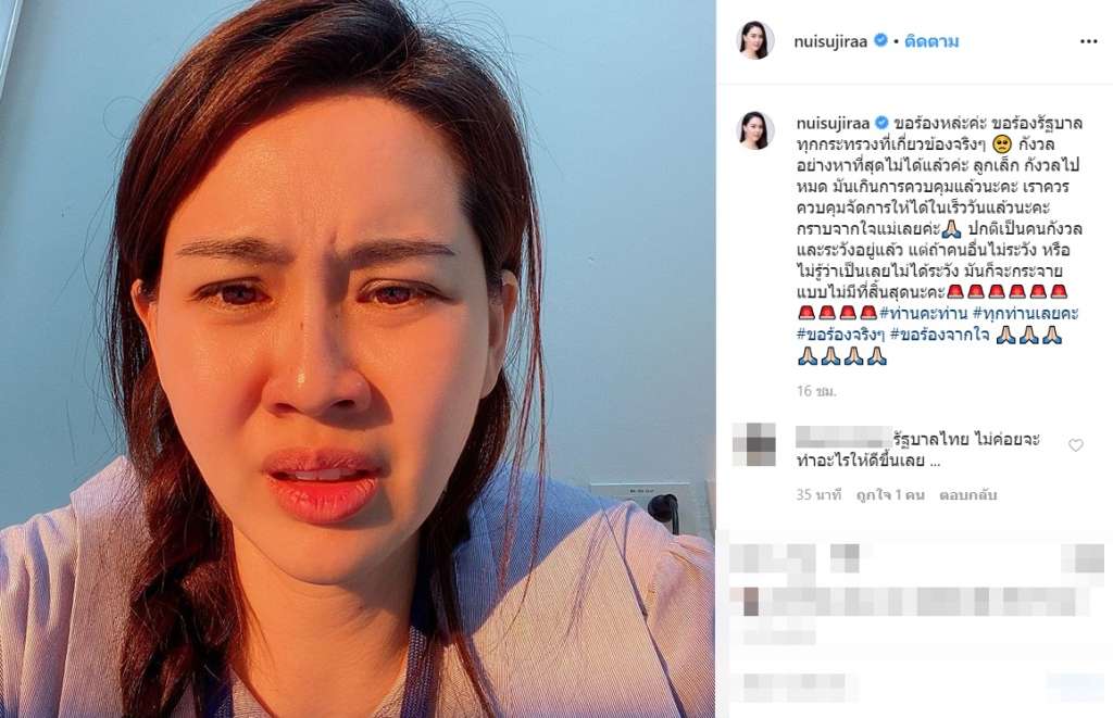 ล่าสุด นุ้ย สุจิรา ก็ได้โพสต์ข้อความผ่านอินสตาแกรมส่วนตัว ระบุข้อความว่า ” ขอร้องหล่ะค่ะ ขอร้องรัฐบาลทุกกระทรวงที่เกี่ยวข้องจริงๆ กังวลอย่างหาที่สุดไม่ได้แล้วค่ะ ลูกเล็ก กังวลไปหมด มันเกินการควบคุมแล้วนะคะ เราควรควบคุมจัดการให้ได้ในเร็ววันแล้วนะคะ กราบจากใจแม่เลยค่ะ ปกติเป็นคนกังวลและระวังอยู่แล้ว แต่ถ้าคนอื่นไม่ระวัง หรือ ไม่รู้ว่าเป็นเลยไม่ได้ระวัง มันก็จะกระจายแบบไม่มีที่สิ้นสุดนะคะ#ท่านคะท่าน #ทุกท่านเลยคะ #ขอร้องจริงๆ #ขอร้องจากใจ”