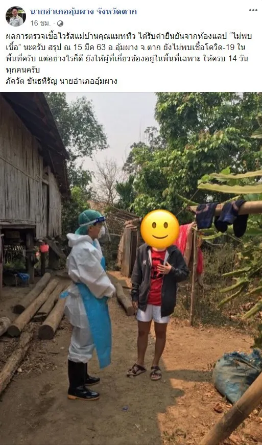 ผลการตรวจแม่บ้านคุณแมทธิว ได้รับคำยืนยันจากห้องแลป ไม่พบ นะครับ สรุป ณ 15 มีค 63 อ อุ้มผาง จ ตาก ยังไม่พบcovid ในพื้นที่ครับ แต่อย่างไรก็ดี ยังให้ผู้ที่เกี่ยวข้องอยู่ในพื้นที่เฉพาะ ให้ครบ 14 วัน ทุกคนครับ