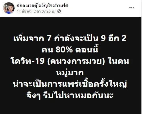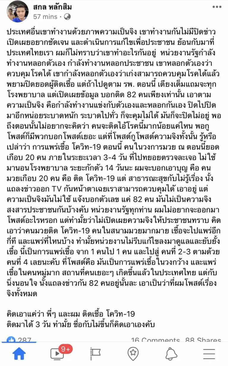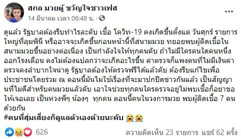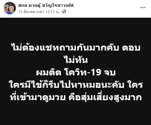 นักมวยอ้างติดโควิค19ใช้ชื่อเฟสบุ๊ค สกล หลักสิม โพสต์ขอความสงสัยทำไมตนเองและคนที่รู้จักอีกกว่า 20 คนที่ติดเชื้อจากสนามมวย ทำไมไม่มีชื่อในลิตส์รายชื่อผู้ติดเชื้อของรัฐบาล ลั่นไม่กลัวอันตราย ความจริงก็คือความจริง!