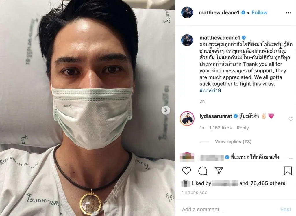 จากนั้นล่าสุด “แมทธิว ดีน” ก็ได้ออกมาอัพเดทอาการในขณะนอนที่โรวพยาบาล พร้อมข้อความระบุว่า “ขอบพระคุณทุกกำลังใจที่ส่งมาให้นะครับ รู้สึกซาบซึ้งจริงๆ เราทุกคนต้องผ่านพ้นช่วงนี้ไปด้วยกัน ไม่แยกกันไม่โทษกันไม่ตีกัน ทุกที่ทุกประเทศกำลังลำบาก Thank you all for your kind messages of support, they are much appreciated. We all gotta stick together to fight this virus. #covid19”