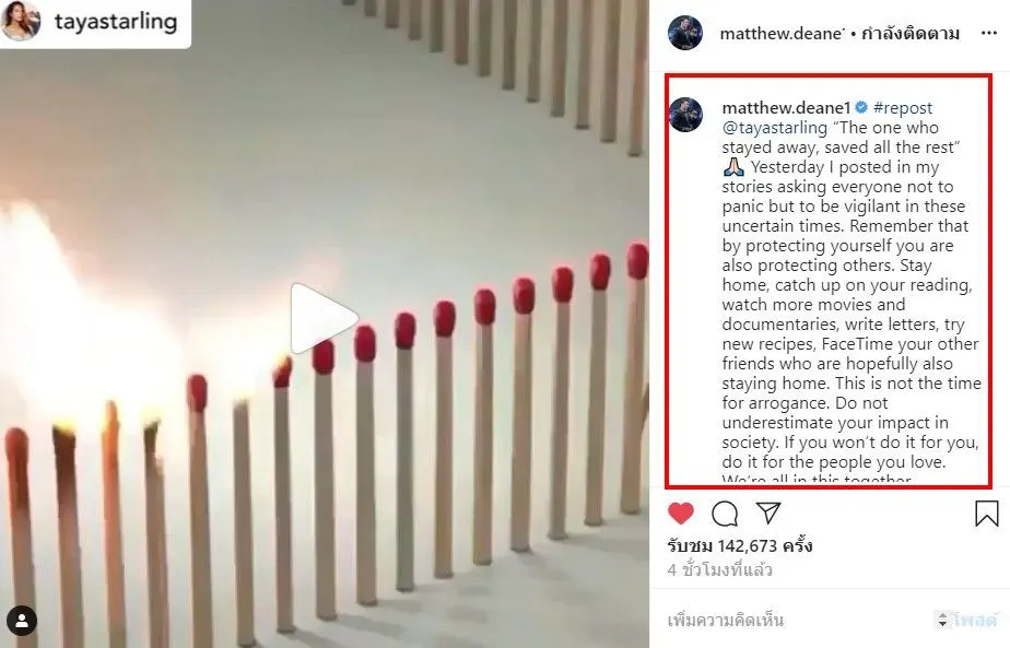 เเละล่าสุด แมทธิว ดีน นั้นก็ได้ฝากข้อความประกาศเตือนคนไทย หลังเข้ารับการรักษา ว่าอย่าประเมินโควิด19 โดย แมทธิว ดีน นั้นได้โพสต์ข้อความเป็นภาษาอังกฤษ ว่า The one who stayed away, saved all the rest” Yesterday I posted in my stories asking everyone not to panic but to be vigilant in these uncertain times. Remember that by protecting yourself you are also protecting others. Stay home, catch up on your reading, watch more movies and documentaries, write letters, try new recipes, FaceTime your other friends who are hopefully also staying home. This is not the time for arrogance. Do not underestimate your impact in society. If you won’t do it for you, do it for the people you love. We’re all in this together.