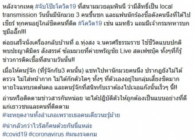 วันนั้นมีนักมวย 3 คนขึ้นชก และแฟนนักร้องชื่อดังคนนึงที่ใต้ไปเชียร์ ทุกคนอยู่ใกล้ชิดคนที่ติด covid-19 เช่น แมทธิว แถมมีเจ้ากรมทหารบกชูมืออี๊ก ต่อยเสร็จนั่งเครื่องกลับบ้านที่ อ.ทุ่งสง จ.นครศรีธรรมราช ใช้ชีวิตแบบปกติพบปะญาติมิตร สังสรรค์ ซ้อมมวยที่ค่ายพรัญชัย Live สดเฟซบุ๊ค ทั้งๆที่ก็รู้ข่าวการติดที่สนามวันนั้น