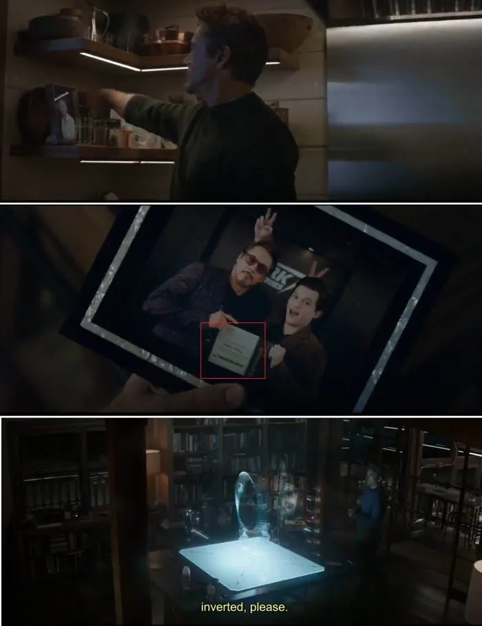 2. โทนี่ ค้นพบโมเดลการเดินทางข้ามเวลาหลังจากที่เขาสั่งให้ “กลับหัว” ซึ่งมีแรงบันดาลใจมาจากภาพถ่ายที่เขาและปีเตอร์ถือใบประกาศนีบัตรกลับหัว