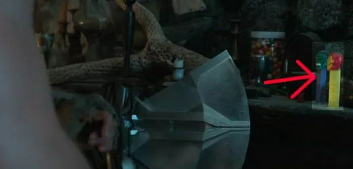 4. ในบ้านของธอร์ มี PEZ แท่งพลาสติกสำหรับใส่ลูกอมที่มีหัวเป็นรูปฮัคและไอออนแมน วางอยู่ข้างๆ สตอร์มเบรคเกอร์