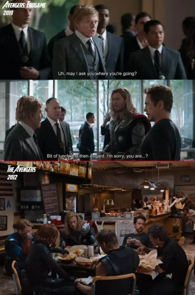 6. ย้อนกลับไปในอดีตหลังจากที่จับโลกิได้ ธอร์บอกว่าเขาจะไป “ทานอาหารเที่ยงนิดหน่อย” ซึ่งมันอ้างอิงไปถึงฉาก End Credit จากเรื่อง The Avengers ในปี 2012 ที่ทุกคนไปนั่งทานอาหารด้วยกัน