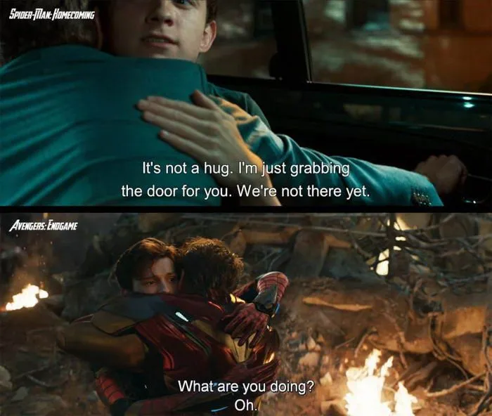 7. โทนี่ปฏิเสธที่จะกอดปีเตอร์ในเรื่อง Spider-Man: Homecoming แต่ในเรื่อง Avengers: Endgame เราจะเห็นโทนี่เลือกที่จะกอดปีเตอร์ก่อน ตอนที่ปีเตอร์กลับมาจากการสลายไป