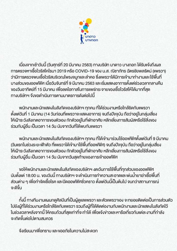 นาดาว บางกอก แถลง ระบุว่า เนื่องจากเช้าวันนี้ (วันศุกร์ที่ 20 มีนาคม 2563) ทางบริษัท นาดาว บางกอก ได้รับแจ้งถึงผล การตรวจหาเชื้อไวรัสโคโรนา 2019 หรือ COVID-19 ของ น.ส. ณิชาภัทร ฉัตรชัยพลรัตน์ (แพรวา)ว่ามีการตรวจพบเชื้อไวรัสบริเวณโพรงจมูกและลำคอ ซึ่งแพรวาได้มีการเข้ามาทำงานและใช้พื้นที่บางส่วนของออฟฟิศ เมื่อวันจันทร์ที่ 9 มีนาคม 2563 และเริ่มแสดงอาการตั้งแต่ช่วงเวลากลางคืนของวันอาทิตย์ที่ 15 มีนาคม พื่อลดโอกาสในการแพร่กระจายของเชื้อไวรัสให้ได้มากที่สุดทางบริษัทฯ จึงขอดำเนินการตามมาตรการดังต่อไปนี้