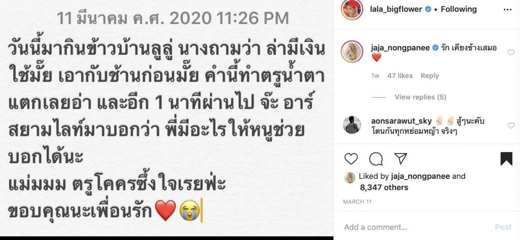 ซึ่งก่อนหน้านี้ทางด้าน สาวลาล่า นั้นได้ออกมาอัดคลิปร้องไห้หลังโดนแคนเซิลงานทั้งหมด หลังมีโควิด-19 ระบาดอย่างหนัก โดยทางด้าน สาวลาล่า ได้บอกว่า วันนี้มากินข้าวบ้านลูลู่ นางถามว่า ล่ามีเงินใช้ไหม คำนี้ทำเอาตรูน้ำตาแตกเลยอ่า และอีก 1 นาทีผ่านไป จ๊ะ อาร์สยามไลน์มาบอกว่า พี่มีอะไรให้หนูช่วยบอกได้นะ แม่มมม ตรูโคตรซึ้งใจเลยฟ่ะ ขอบคุณนะเพื่อนรัก