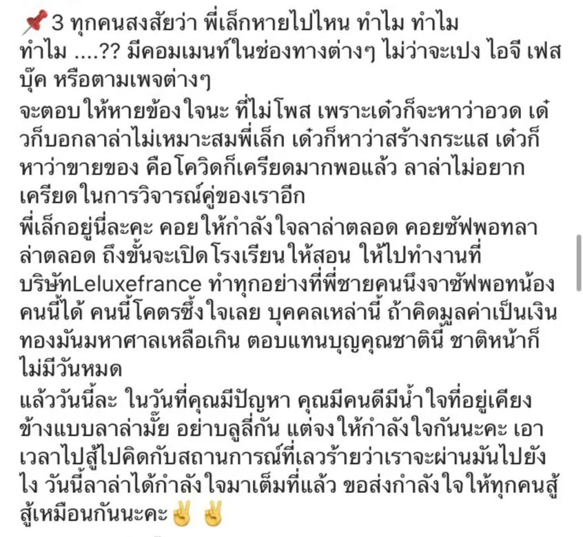 ภายหลังทางด้าน สาวลาล่า ก็ได้ออกมาชี้แจงเอาไว้ว่า ทุกคนสงสัยว่า พี่เล็กหายไปไหน ทำไม ทำไม ทำไม ….?? มีคอมเมนท์ในช่องทางต่างๆ ไม่ว่าจะเปง ไอจี เฟสบุ๊ค หรือตามเพจต่างๆ