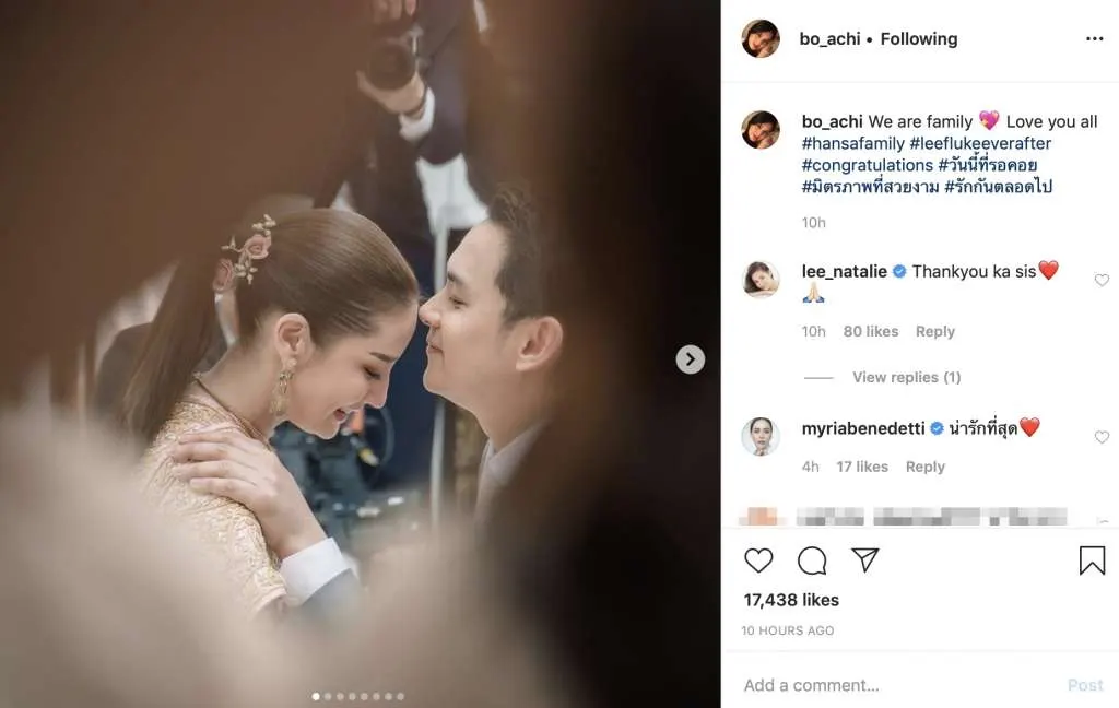 ล่าสุดทางด้าน สาวโบ ได้ออกมาโพสต์รูปในวันแต่งงานของอดีตสามี หนุ่มฟลุค และ สาวนาตาลี พร้อมกับอวยพร We are family Love you all #hansafamily #leeflukeeverafter congratulations วันนี้ที่รอคอย มิตรภาพที่สวยงาม รักกันตลอดไป ต้องบอกเลยว่าน้อยครั้งที่เราจะเห็นความสัมพันธ์อันดีงามของอดีตคู่รักที่มีให้แก่กันเช่นนี้ เห็นแบบนี้แล้วคงต้องบอกเลยว่านับถือหัวใจเธอจริงๆ