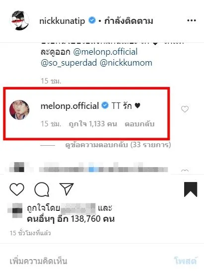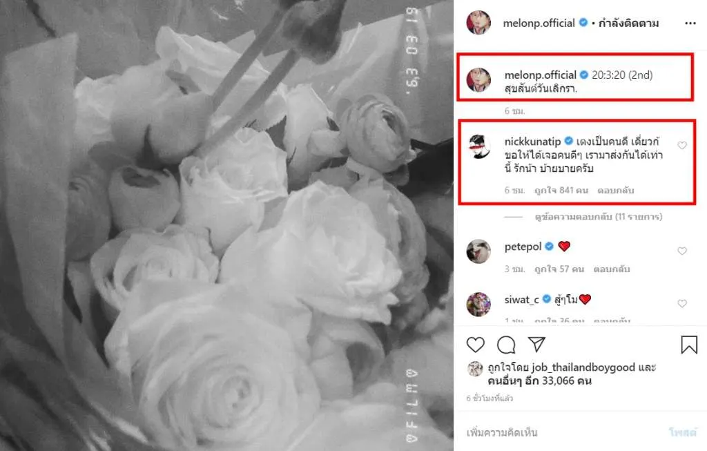 จากนั้น แตงโม นิดา โผล่คอมเมนต์ทันที หลัง นิก คุณาธิป ประกาศขอคืนดีกลางไอจี โดย แตงโม นิดา ได้เเสดงความคิดเห็นว่า รัก อีกด้วย