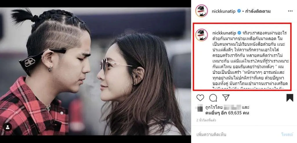 ซึ่งงานนี้ นิก คุณาธิป ได้โพสต์ระบุข้อความว่า จริงๆเราสองคนผ่านอะไรด้วยกันมามากช่วยเหลือกันมาตลอด โมเป็นคนพาผมไปเรียนหนังสือด้วยกัน เเนะนำเเต่สิ่งดีๆ ให้ความรักความเอาใจใส่ ครอบครัวเรารักกัน หลายคนคิดว่าเราไม่เหมาะกัน เเต่มีเเต่ใจเรา2คนที่รู้ว่าเราเหมาะกันเเค่ไหน ยอมรับเลยว่าช่วงหลังๆ ” ผมป่วยเป็นซึมเศร้า “หนักมากๆ อารมณ์เเละทุกอย่างมันไม่ปกติกว่าที่เคย ด้วยปัญหาของทั้งคู่ มันถาโถมเข้ามาจนเราต่างเครียดไม่มีเวลาให้กัน มีความน้อยอกน้อยใจกันเเล้วไม่ได้พูด ขอโทษที่ทำตัวไม่น่ารักบ่อยๆ เเต่นี่อะเป็นคนน่ารักนะปกติ ดีกันนะขอโทษเราจะจูงมือกันต่อไปได้มั้ย จะทำให้ดีที่สุด รักษาโรคบ้านี่ให้หายละไปช่วยคนไปช่วยสังคมกันเถอะ รัก รักเเหละดูออก @melonp.official @so_superdad @nickkumom