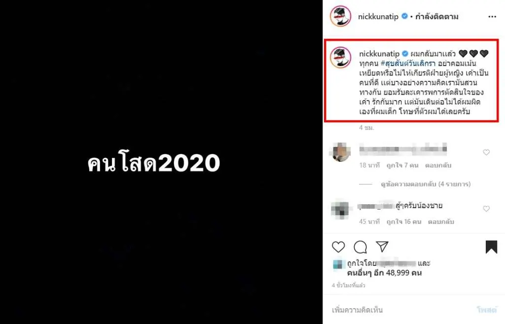 โดย นิก คุณาธิป ได้ระบุข้อความว่า คนโสด2020 ผมกลับมาเเล้วทุกคน สุขสันต์วันเลิกรา อย่าคอมเมนต์เหยียดหรือไม่ไห้เกียรติฝ่ายผู้หญิง เค้าเป็นคนที่ดี เเต่บางอย่างความคิดเรามันสวนทางกัน ยอมรับละเคารพการตัดสินใจของเค้า รักกันมาก เเต่มันเดินต่อไม่ได้ผมผิดเองที่ผมเด็ก โทษที่ตัวผมได้เลยครับ