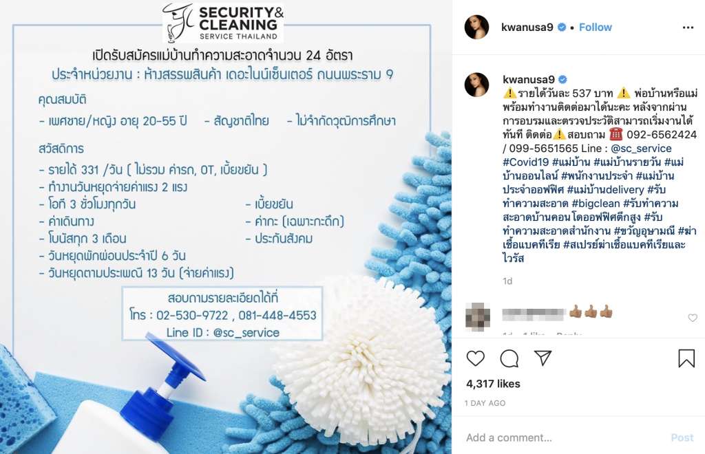 โดยทางด้าน สาวขวัญ ได้โพสต์ชี้แจงรายละเอียดเอาไว้ว่า รายได้วันละ 537 บาท พ่อบ้านหรือแม่พร้อมทำงานติดต่อมาได้นะคะ หลังจากผ่านการอบรมและตรวจประวัติสามารถเริ่มงานได้ทันที ติดต่อสอบถาม 092-6562424 / 099-5651565 Line : @sc_service