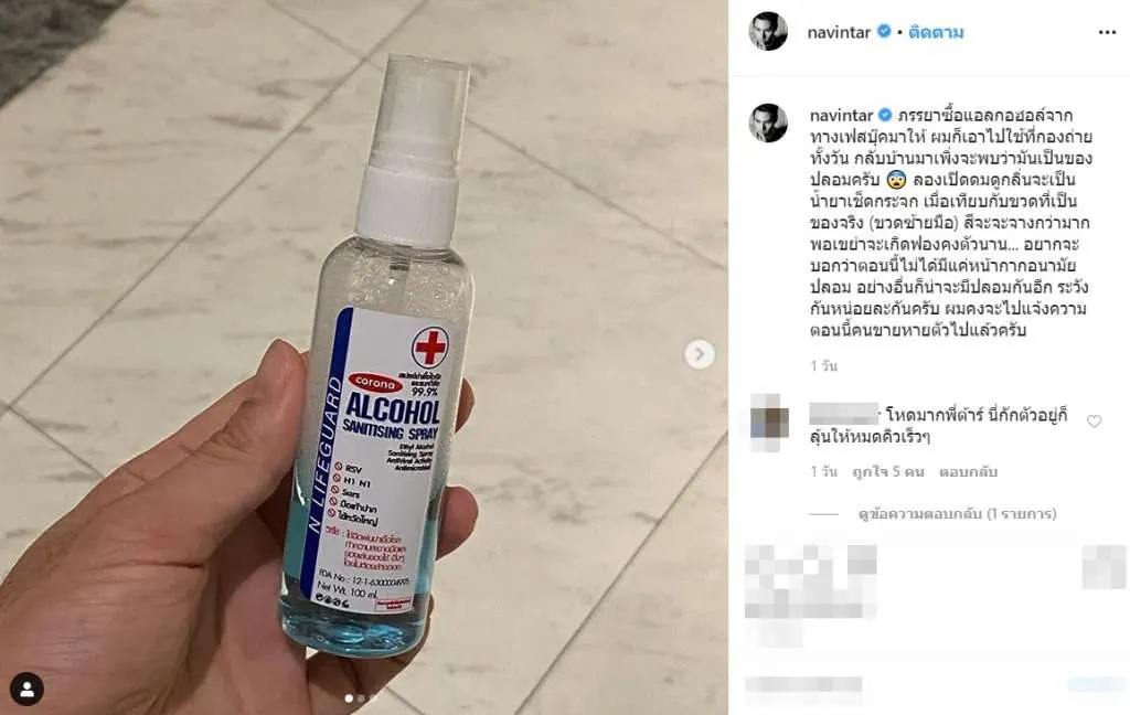 นาวิน ต้าร์ โพสต์เตือนภัย หลังเจอสเปรย์แอลกอฮอล์ปลอม พอเปิดดูคาดเป็นน้ำยาเช็ดกระจก