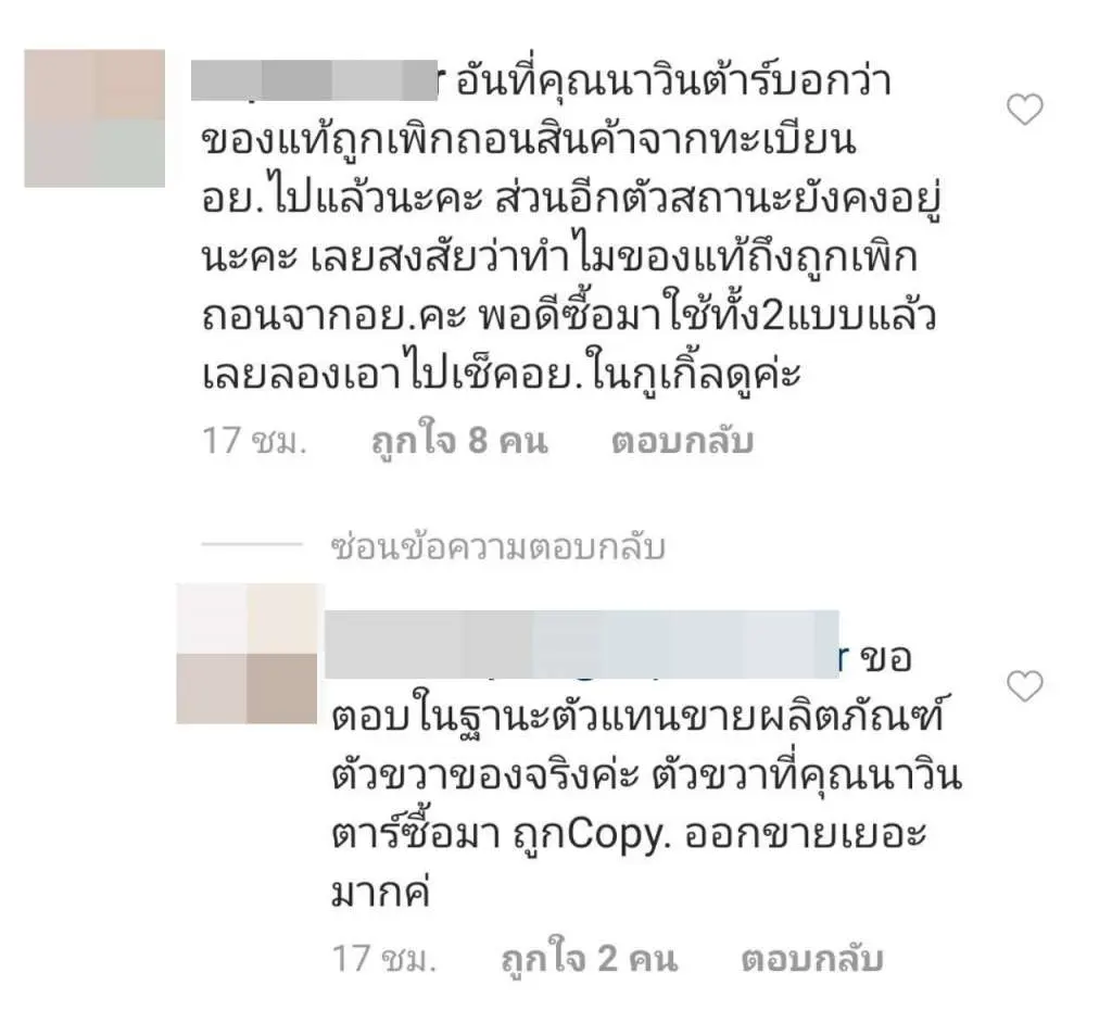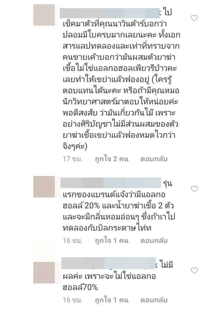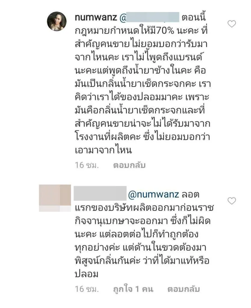 งานนี้ ก็มีชาวเน็ตหลายคนเข้ามาคอมเมนต์ถามไถ่เกี่ยวกับสินค้าแบรนด์ดังกล่าว โดยทาง ไฮไซฟน้ำหวาน พัสวี ภรรยาของหนุ่มนาวิน ต้าร์ ก็ได้เข้ามาตอบคอมเมนต์ว่า ” ตอนนี้กฎหมายกำหนดให้มี 70% นะคะ ที่สำคัญคนขายไม่ยอมบอกว่ารับมาจากไหนค่ะ เราไม่ได้พูดถึงแบรนด์นะคะ แต่พูดถึงน้ำยาข้างในค่ะ คือมันเป็นกลิ่นน้ำยาเช็ดกระจกค่ะ เราคิดว่าเราได้ของปลอมมาค่ะ เพราะมันคือกลิ่นน้ำยาเช็ดกระจก และที่สำคัญคนขายน่าจะไม่ได้รับมาจากโรงงานที่ผลิตค่ะ ซึ่งไม่ยอมบอกว่าเอามาจากไหน” และ “มั่นใจว่าไม่ใช่แน่นอนค่ะ มันคือน้ำยาเช็ดกระจกเลยค่ะ แบ่งกันหลายคนทุกคนเป็นหมดเลยค่ะ และคนขายตอนแรกบอกซื้อที่โรงงาน เราบอกว่านั้นขอใบที่ซื้อจากโรงงานมาดูหน่อย เพราะแบรนด์นี้มีแต่คนใช้เยอะ และที่เคยใช้ไม่ใช่แบบนี้ เพราะก่อนหน้านี่ไม่กี่วันก็ซื้อมาคนละแบบเลย และคนขายก็เปลี่ยนบอกรับมาอีกที ซึ่งก็ไม่บอกว่ารับจากไหนมาค่ะ แต่ต้องช่วยเข้าใจนิดนึงนะคะว่าเราไม่ได้บอกว่าแบรนด์ไหนคือของปลอมค่ะ เราบอกว่าสิ่งที่เราได้มาคือมันปลอม เพราะกลิ่นมันไม่ใช่ที่เคยใช้เลยค่ะ มันคือน้ำนาเช็ดกระจกเลยค่ะ”