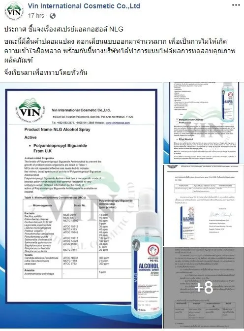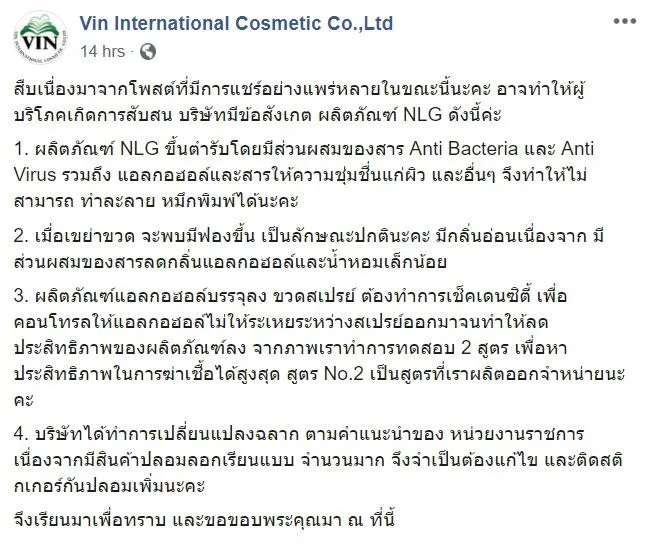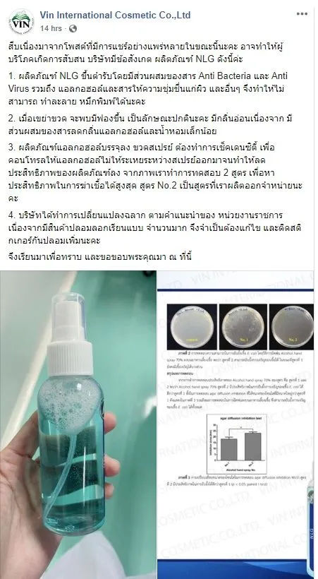 หลังจากตอ่มาไม่นาน ทางบริษัทผู้ผลิตสเปรย์ แอลกอฮอล์แบรนด์ดังกล่าว ก็ได้ออกมาโพสต์ชี้แจงว่า ขณะนี้มีสินค้าปลอมแปลง ลอกเลียนแบบออกมาจำนวนมาก พร้อมชี้แจงกรณีโพสต์ที่มีการแชร์อย่างแพร่หลายตอนนี้ ดังนี้
