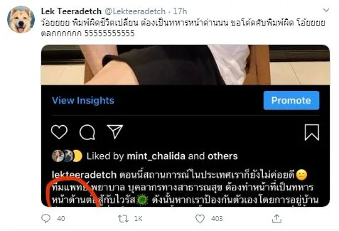 เป็นอีกหนึ่งนักแสดงหนุ่มอารมณดีอย่าง อาเล็ก ธีรเดช ถึงกับต้องออกมาชี้แจงด่วนผ่านทวิตเตอร์ส่วนตัว หลังจากที่เจ้าตัวได้โพสต์ข้อความเพื่อให้กำลังใจทีมแพทย์ พยาบาล บุคคลสาธารณสุข ซึ่งต้องหน้าที่เป็นทหาร “หน้าด่าน” เพื่อต่อสู้กับเชื้อไวรัสโควิด-19 ที่กำลังแพร่ระบาดหนักอยู่ในขณะนี้ ดูเหมือนว่างานนี้ หนุ่มอาเล็ก ดันพิมพ์ผิดเป็น “หน้าด้าน” ซึ่งทำให้ความหมายเปลี่ยนไปทันที