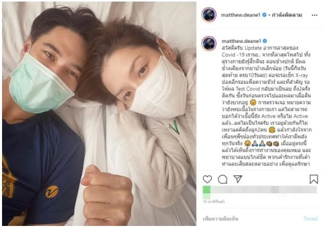 ล่าสุด หนุ่มแมทธิว โพสต์อินสตาแกรมอัพเดตอาการว่า สวัสดีครับ Update อาการล่าสุดของ โควิด-19 เรานะ.. จากที่ล่าสุดโพสต์ไป ทั้งคู่ร่างกายยังรู้สึกดีนะ ค่อนข้างปกติ มีผลข้างเคียงจากยาบ้างเล็กน้อย (วันนี้กินวันสุดท้าย ครบ10วันละ) ต่อจะรอเช็ก X-ray ปอดอีกรอบเพื่อความชัวร์