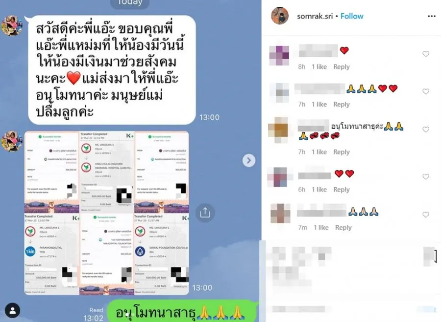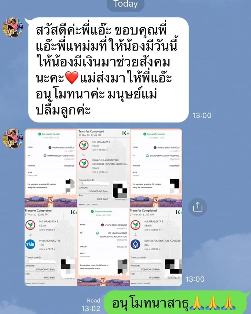 โดยผู้ใช้อินสตาแกรม somrak.sri ได้โพสต์ภาพแชทไลน์ของคุณแม่ปลา คุณแม่ของสาวญาญ่า ส่งข้อความมาบอกว่า “สวัสดีค่ะพี่แอ๊ะ ขอบคุณพี่แอ๊ะพี่แหม่มที่ให้น้องมีวันนี้ ให้น้องมีเงินมาช่วยสังคมนะคะ แม่ส่งมาให้พี่แอ๊ะอนุโมทนาค่ะ มนุษย์แม่ปลื้มลูกค่ะ” พร้อมแนบหลักฐานการโอนเงินที่สาวญาญ่า ร่วมทำบุญกับ 6 หน่วยงานทางการแพทย์ ได้แก่ มูลนิธิรามาธิบดีฯ, รพ.จุฬาลงกรณ์, สถาบันบำราศนราดูร, รพ.พระมงกุฎเกล้า, มูลนิธิ 100 ปี รพ.มหาราชฯ และศิริราชมูลนิธิ เพื่อช่วยสู้วิกฤต COVID-19 ที่ละ 5 แสนบาท รวมเป็นเงิน 3 ล้านบาท”