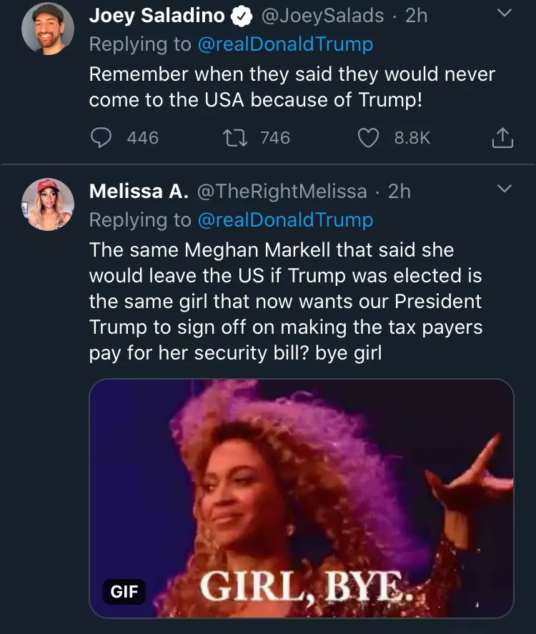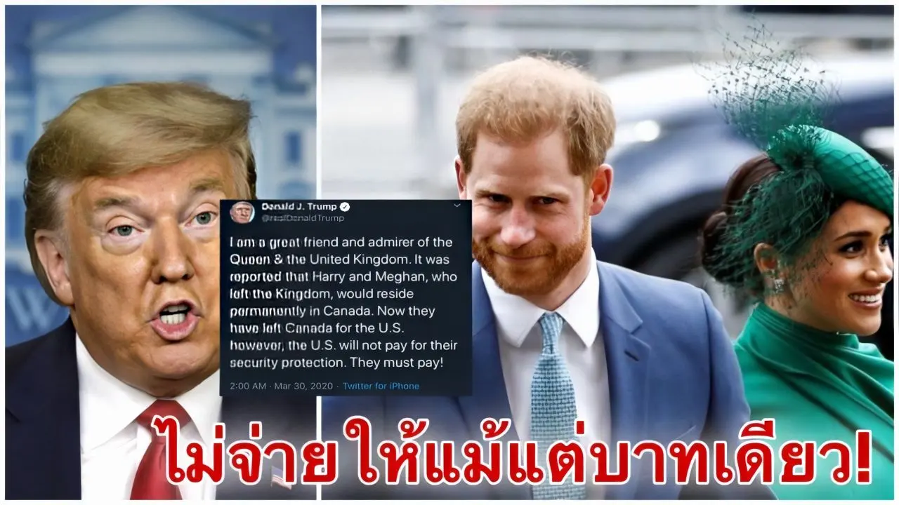 ไม่รู้ว่าเป็ความแค้นส่วนตัวหรือว่าอย่างไรที่ทรั้มถึงกับต้องออกมาประกาศผ่านทวิตว่าจะไม่ซับพอร์ตค่าซิคิวริตี้ให้กับ แฮร์รี่และเมแกน อย่างแน่นอน หลังทั้งคู่ ทิ้งราชวงศ์มาอยู่แคนาดาและกำลังจะย้ายจากแคนนาดามาอยู่ที่ LA โดยทรั้มป์ได้ประกาศว่า