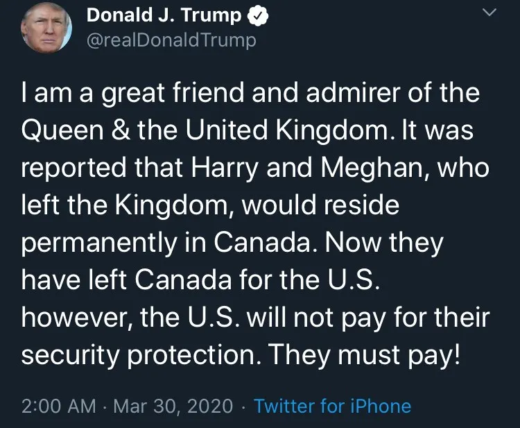 'ผมเป็นเพื่อนที่ยิ่งใหญ่และเป็นที่ชื่นชอบของราชินีและอังกฤษ.มีรายงานว่าแฮร์รี่และเมแกนทิ้งราชวงศ์อย่างถาวรไปใช้ชีวิตในแคนนาดา และตอนนี้พวกเขาได้ทิ้งแคนนาดามาสหรัฐอเมริกา อย่างไรก็ตามสหรัฐอเมริกาจะไม่มีการจ่ายค่ารักษาความปลอดภัย พวกเขาต้องจ่าย!"