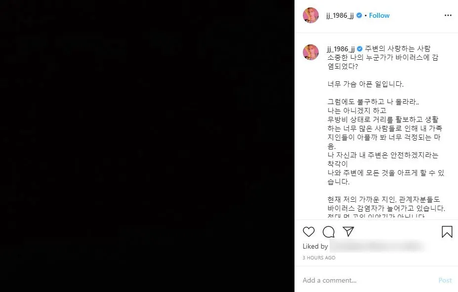 โดย แจจุง โพสต์บอกแฟนๆ ยอมรับว่า การติดเชื้อเป็นเพราะความสะเพร่าของตัวเอง เพิกเฉยคำแนะนำของรัฐบาลและทุกคนรอบตัว เขารู้แล้วว่า พฤติกรรมของคนคนเดียวอาจก่อผลกระทบต่อสังคมส่วนรวมได้มากแค่ไหน “ขอโทษทุกคนที่อาจติดเชื้อไวรัสเพราะผม” ศิลปินดังโทษตัวเองอีกครั้งว่าเพราะการตัดสินใจโง่ๆ ที่นำพาตัวเองมาสู่จุดนี้ เขาได้แค่คิดว่าไม่น่าจะเกิดเรื่องแบบนี้กับตัวเอง แจจุง ขอบคุณและขอโทษการกระทำของตัวเอง และว่ามีหลายอย่างที่อยากจะบอกและมีคนมากมายที่เขาอยากจะพบ