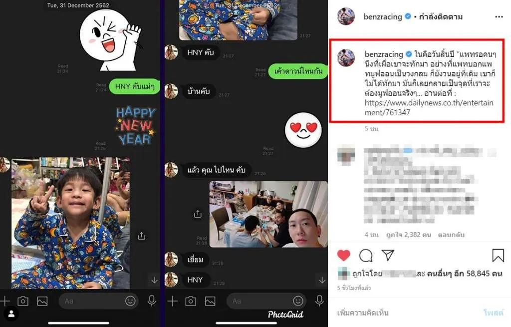 เเละเมื่อวานนี้ เบนซ์ เรซซิ่ง นั้นก็ได้แฉข้อความสำคัญ หลังอดีตภรรยา แพท ณปภา เผยสาเหตุเลิกแบบหนังคนละม้วน! ซึ่ง เบนซ์ เรซซิ่ง ก็ได้โพสต์ภาพการสนทนาไลน์ระหว่างตนเองกับ สาวแพท ในคืนวันสิ้นปีที่ผ่านมา โดย เบนซ์ เรซซิ่ง ก็ได้เผยข้อความในคืนสิ้นปี ว่าตนเองก็ได้ทักไปหาอดีตภรรยา ไม่ใช่ไม่ทักไป อย่างที่ฝ่ายหญิงกล่าว ซึ่งงานนี้ชาวเน็ตต่างก็สับสนว่าใครคือต้นเหตุในการสะบั้นรักครั้งนี้กันเเน่ เเต่ก็มีชาวเน็ตอีกฝ่ายที่เข้ามาให้กำลังใจทั้งคู่กันอย่างมากมายเลยทีเดียว