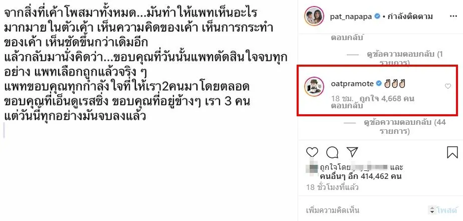 หลังจากนั้น โอ๊ต ปราโมทย์ ทนไม่ไหว โผล่คอมเมนต์กลางไอจี แพท ณปภา หลังประกาศจบความสัมพันธ์พ่อของลูก กลางไอจี โดย โอ๊ต ปราโมทย์ เเสดงความคิดเห็นชู2นิ้ว ส่งกำลังใจให้ สาวแพท ผ่านสถานการณ์นี้ไปให้ได้อีกด้วย