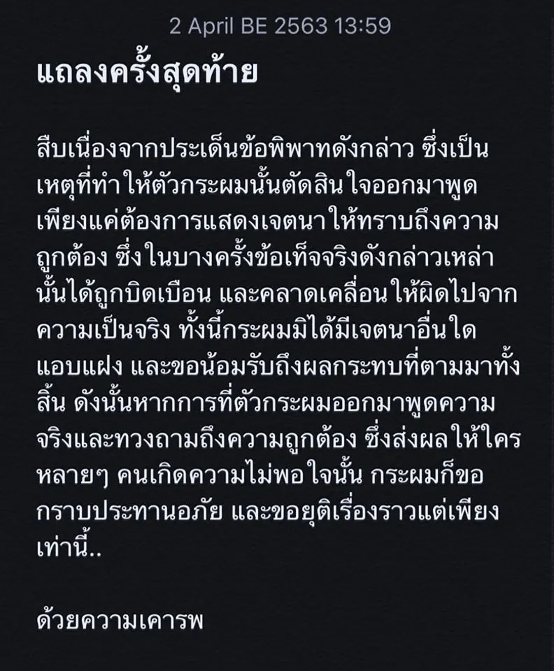 ล่าสุด เฟซบุ๊ก เบนซ์ โพสต์ข้อความระบุว่า แถลงครั้งสุดท้ายสืบเนื่องจาประเด็นข้อพิพาทดังกล่าว ซึ่งเป็นเหตุที่ทำให้ตัวกระผมนั้นตัดสินใจออกมาพูดเพียงแค่ต้องการแสดงเจตนาให้ทราบถึงความถูกต้อง ซึ่งในบางครั้งข้อเท็จจริงดังกล่าวเหล่านั้นได้ถูกบิดเบือน และคลาดเคลื่อนให้ผิดไปจากความเป็นจริง ทั้งนี้กระผมมิได้มีเจตนาอื่นใดแอบแฝง และขอน้อมรับถึงผลกระทบที่ตามมาทั้งสิ้น ดังนั้นหากการที่ตัวกระผมออกมาพูดความจริงและทวงถามถึงความถูกต้อง ซึ่งส่งผลให้ใครหลายๆ คนเกิดความไม่พอใจนั้น กระผมก็ขอกราบประทานอภัย และขอยุติเรื่องราวแต่เพียงเท่านี้..ด้วยความเคารพ