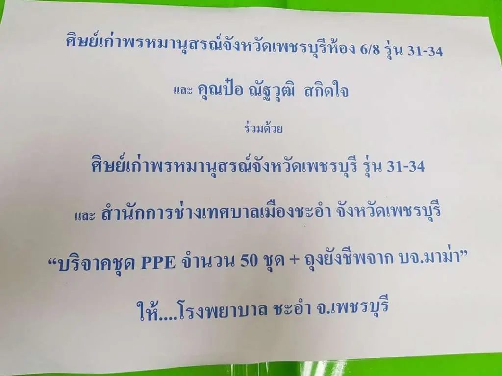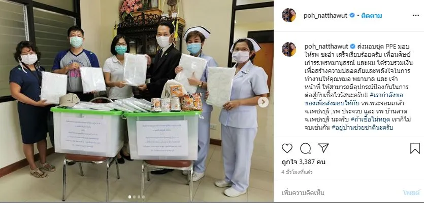 ทั้งนี้หนุ่มป๋อ ก็ได้โพสต์ผ่านลงในอินสตาแกรมส่วนตัว พร้อมทั้งระบุข้อความว่า ” ส่งมอบชุด PPE มอบให้รพ ชะอำ เสร็จเรียบร้อยครับ เพื่อนศิษย์เก่ารร.พรหมานุสรณ์ และผม ได้รวบรวมเงินเพื่อสร้างความปลอดภัยและพลังใจในการทำงานให้คุณหมอ พยาบาล และ เจ้าหน้าที่ ให้สามารถมีอุปกรณ์ป้องกันในการต่อสู้กับเชื้อไวรัสนะครับ!! #เรากำลังขอของเพื่อส่งมอบให้กับ รพ.พระจอมเกล้า จ.เพชรบุรี ,รพ ประจวบ และ รพ บ้านลาด จ.เพชรบุรี นะครับ #ถ้าเชื้อไม่หยุด เราก็ไม่จบเช่นกัน #อยู่บ้านช่วยชาตินะครับ”