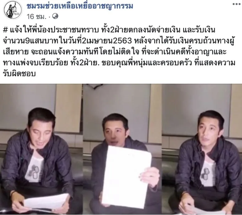 ต่อมาทางด้านทนายได้ออกมาชี้แจงว่า ทั้ง 2 ฝ่าย ได้ตกลงคืนเงินกันได้แล้ว และจะรับเงินคืนจำนวน 9 แสนบาท ในวันที่ 2 เมษายน 2563 และเมื่อได้รับเงินทางผู้เสียหายก็ไม่ติดใจอะไรและจะถอนแจ้งความทันที