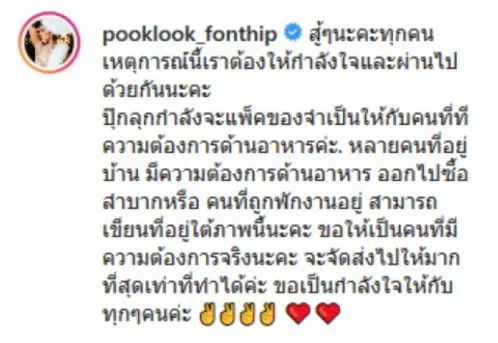 โดยสาวปุ๊กลุ๊ก ได้โพสต์ภาพ อาหาร ของใช้ต่างๆที่จำเป็นในการดำรงชีวิต พร้อมข้อความระบุว่า สู้ๆนะคะทุกคน เหตุการณ์นี้เราต้องให้กำลังใจและผ่านไปด้วยกันนะคะ ปุ๊กลุกกำลังจะแพ็คของจำเป็นให้กับคนที่ทีความต้องการด้านอาหารค่ะ