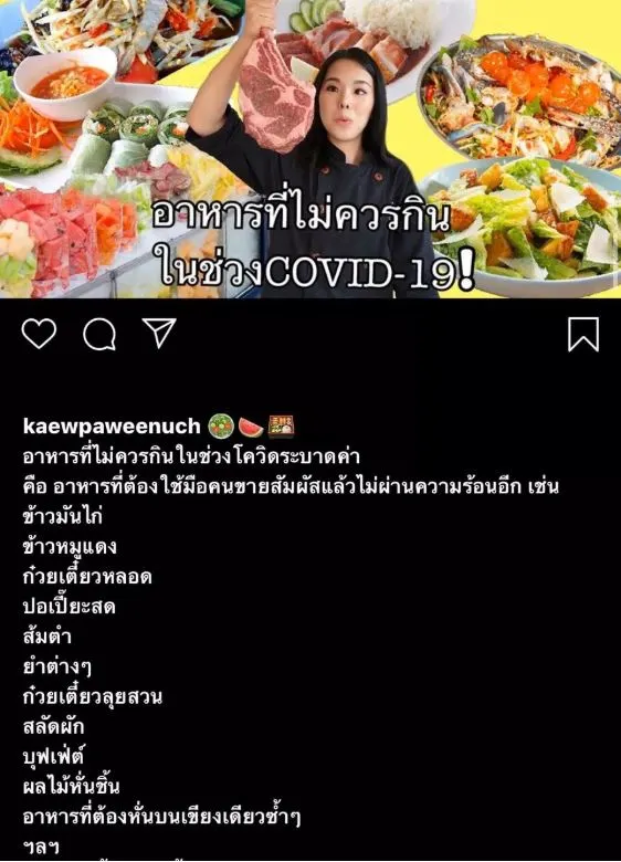 เรียกได้ว่างานเข้าอย่างจัง สำหรับสาวแก้ว ปวีณ์นุช ยอดปรีชาวิจิตร ผู้ชนะเลิศรายการแข่งขันทำอาหารชื่อดังอย่าง Masterchef Thailand ซีซั่น 1 โดยก่อนหน้านี้เธอได้ออกมาโพสต์เตือนอาหารที่ควรเลี่ยงในช่วงโควิด-19 ระบาด