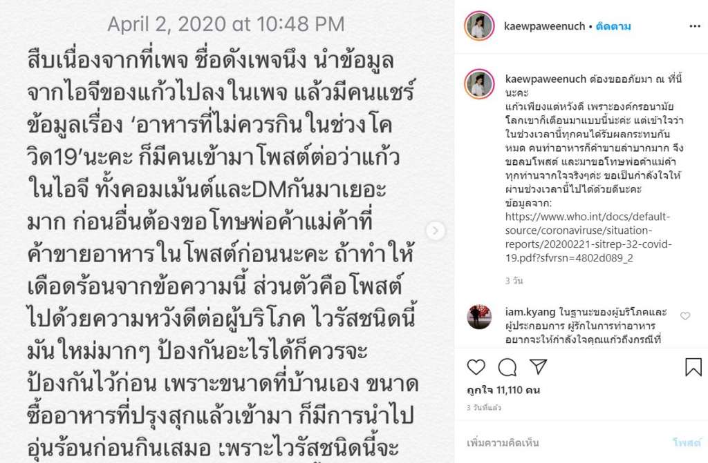 “ต้องขออภัยมา ณ ที่นี้นะคะ แก้วเพียงแต่หวังดี เพราะองค์กรอนามัยโลกเขาก็เตือนมาแบบนี้น่ะค่ะ แต่เข้าใจว่าในช่วงเวลานี้ทุกคนได้รับผลกระทบกันหมด คนทำอาหารก็ค้าขายลำบากมาก จึงขอลบโพสต์ และมาขอโทษพ่อค้าแม่ค้าทุกท่านจากใจจริงๆค่ะ ขอเป็นกำลังใจให้ผ่านช่วงเวลานี้ไปได้ด้วยดีนะคะ”