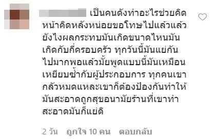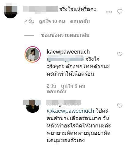 อย่างไรก็ตามในคอมเมนต์ก็มีทั้งคนที่เข้าใจและเห็นด้วยกับเธอ และคนที่ไม่เห็นด้วยกับข้อความของเธอและบอกให้เธอคิดให้มากกว่านี้ก่อนโพสต์อะไรเพราะเป็นคนดัง ประชาชนจะเชื่อถือได้มากกว่านั่นเอง