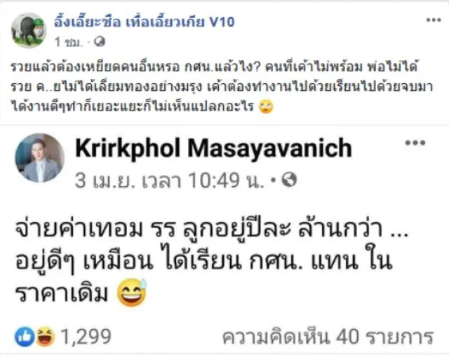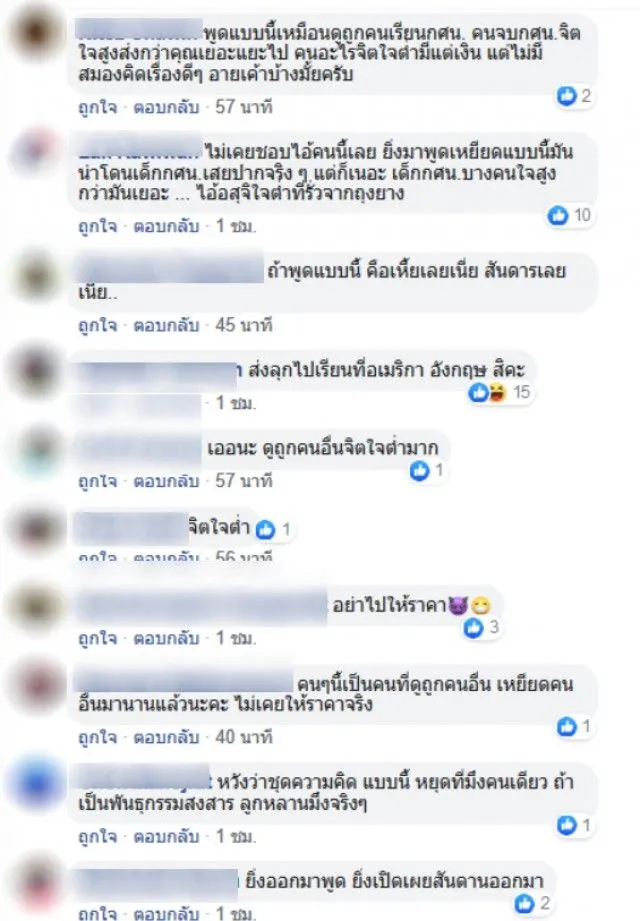 สร้างความไม่พอใจให้กับชาวโซเชี่ยลเป็นอย่างมาก ล่าสุด เพจ อึ้งเอี๊ยะซือ เทื้อเอี้ยวเกีย V10 ได้โพสต์ข้อความระบุว่า รวยแล้วต้องว่าคนอื่นหรอ กศน แล้วไง คนที่เขาไม่พร้อม พ่อไม่ได้รวย ไม่ได้เลี่ยมทองอย่างคุณ เขาต้องทำงานไปด้วยเรียนไปด้วยจบมาได้งานดีๆทำก็เยอะแยะก็ไม่เห็นแปลกอะไร